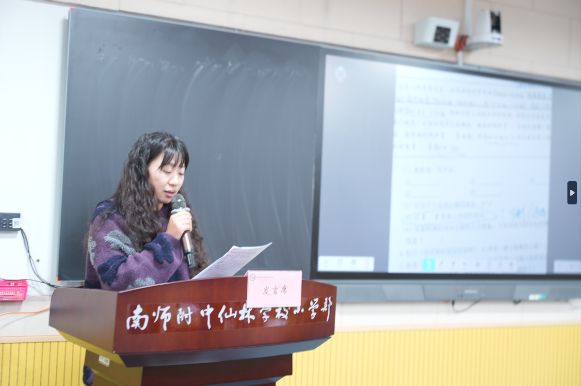 2025年11月10日下午,“减负·增效·提质”栖霞区小学语文课时作业设计专题研讨暨孙洪伟名师工作室活动在南师附中仙林学校小学部顺利开展。栖霞区教师发展中心小学语文研训员陈瑶老师、 南京市学科带头人李洁校长、南师附中仙林学校小学部执行校长蒋浩、江苏省特级教师孙洪伟副校长、刘伟副校长,孙洪伟名师工作室成员、部分集团的小学语文骨干教师代表共同参与了此次活动。