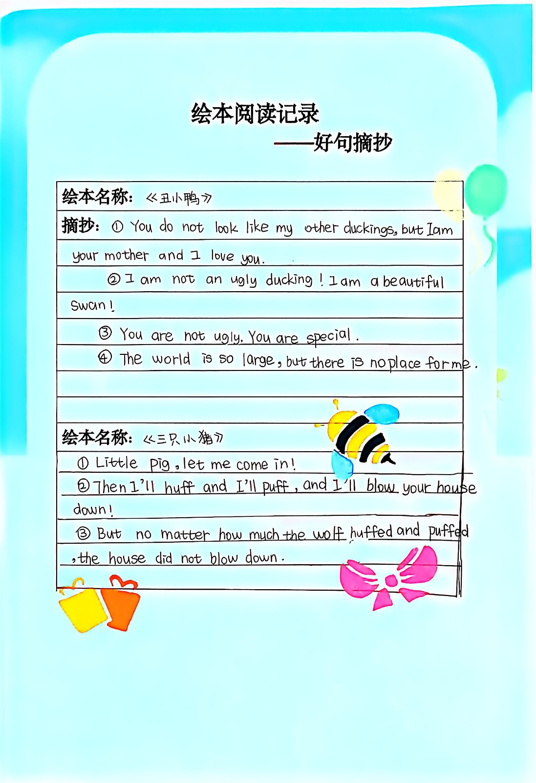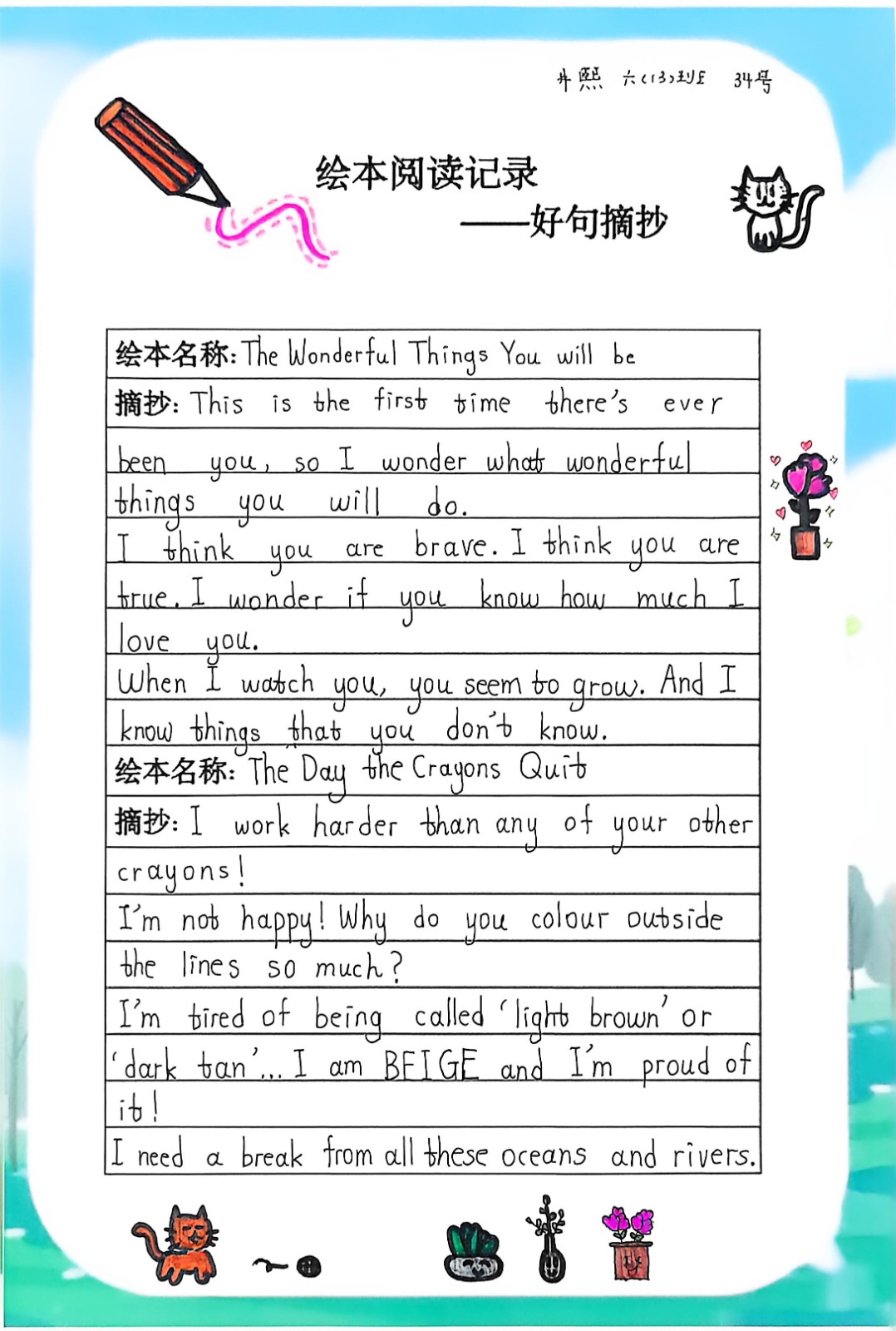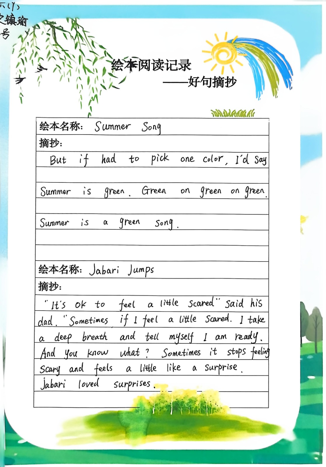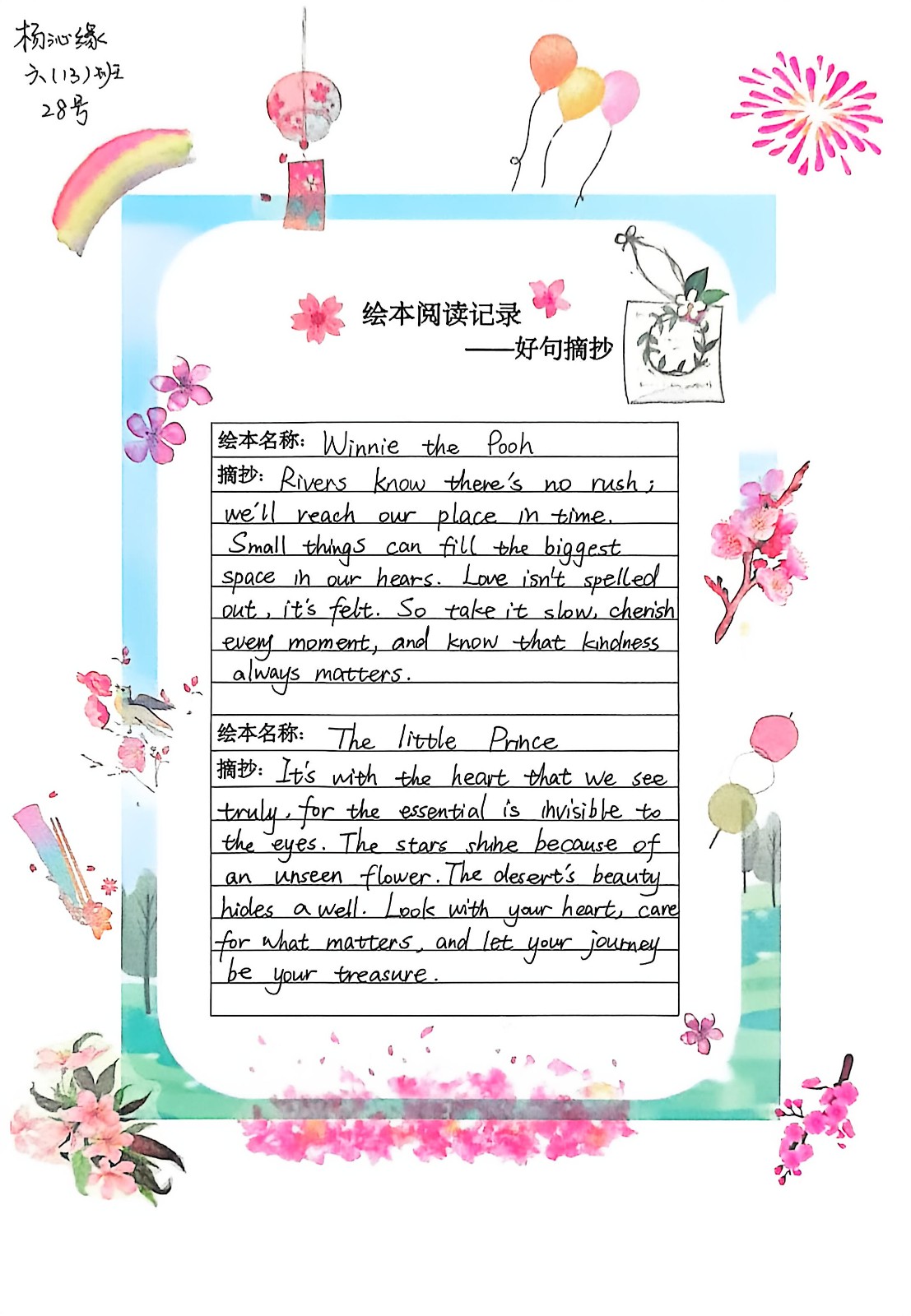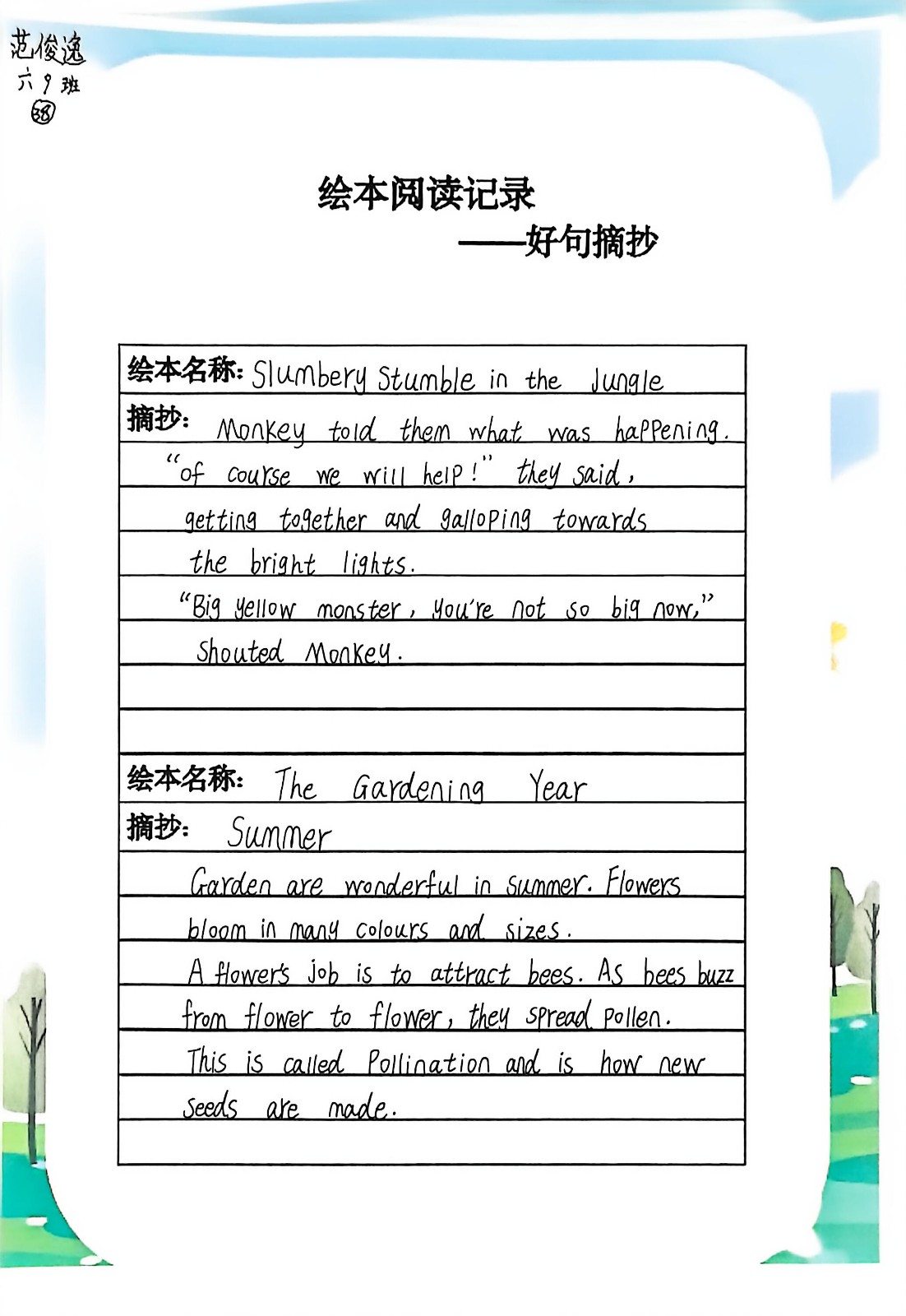 暑假期间,小学六年级的同学们以英语绘本为桥梁,开启了一段充满趣味与收获的语言学习之旅,不少同学还认真进行好词好句摘抄,为英语素养提升添砖加瓦。