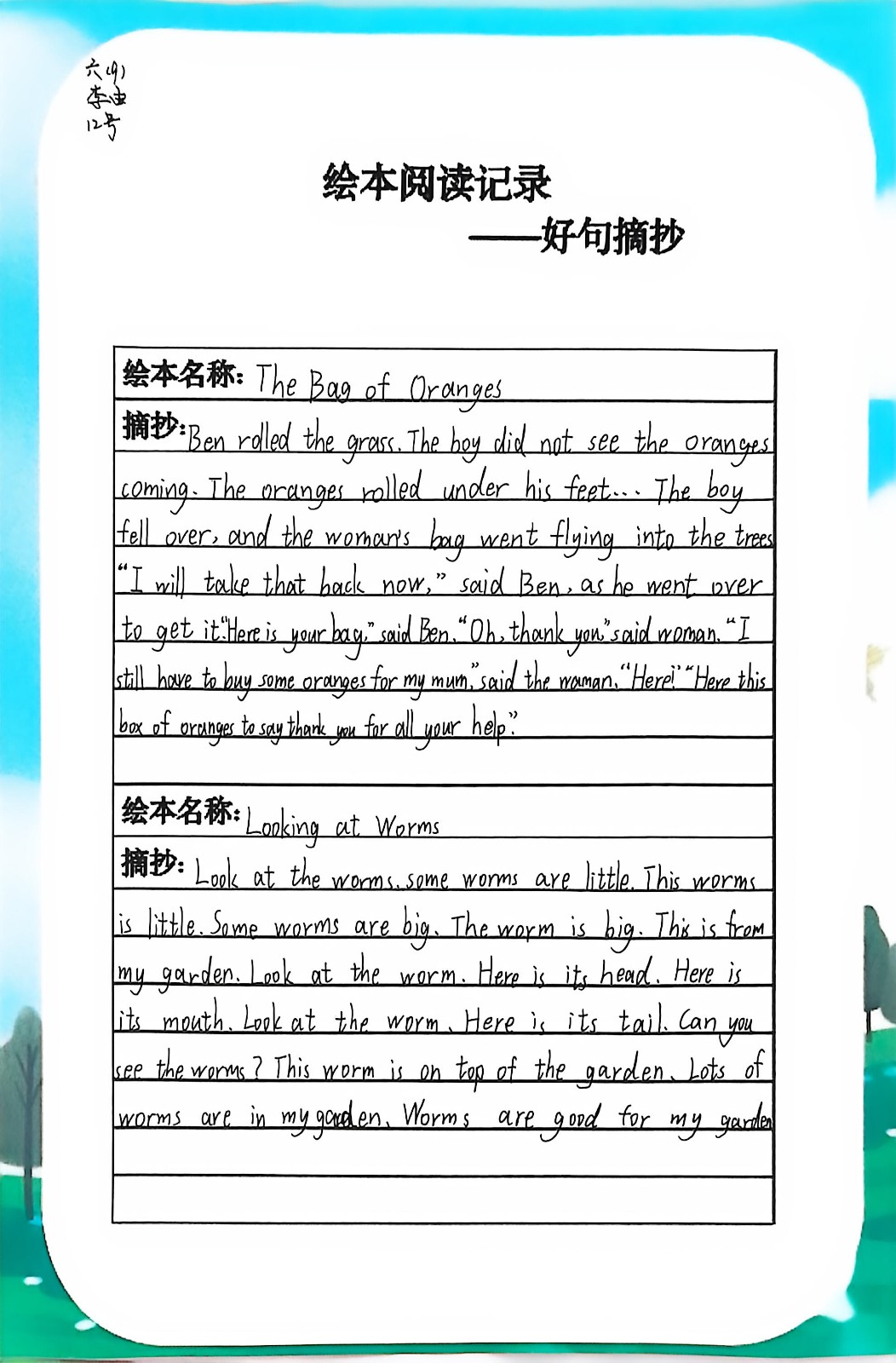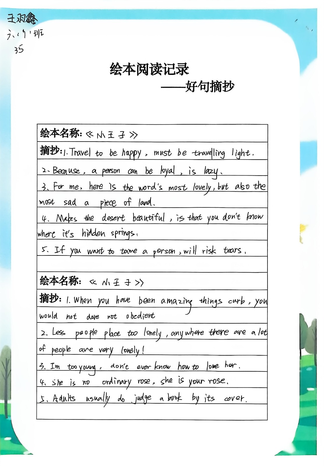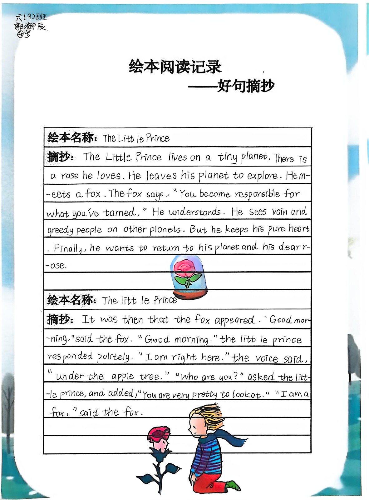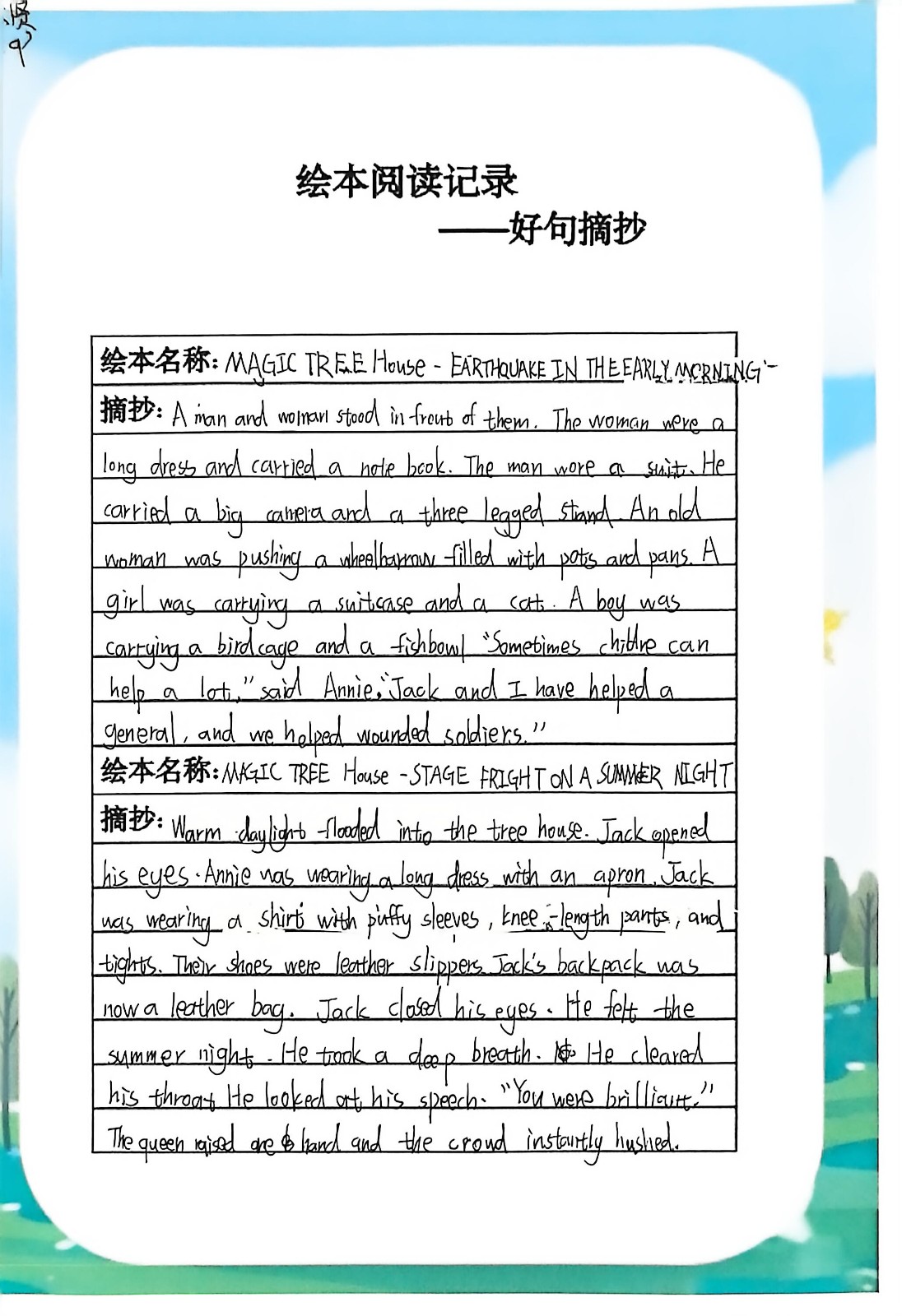 暑假期间,小学六年级的同学们以英语绘本为桥梁,开启了一段充满趣味与收获的语言学习之旅,不少同学还认真进行好词好句摘抄,为英语素养提升添砖加瓦。