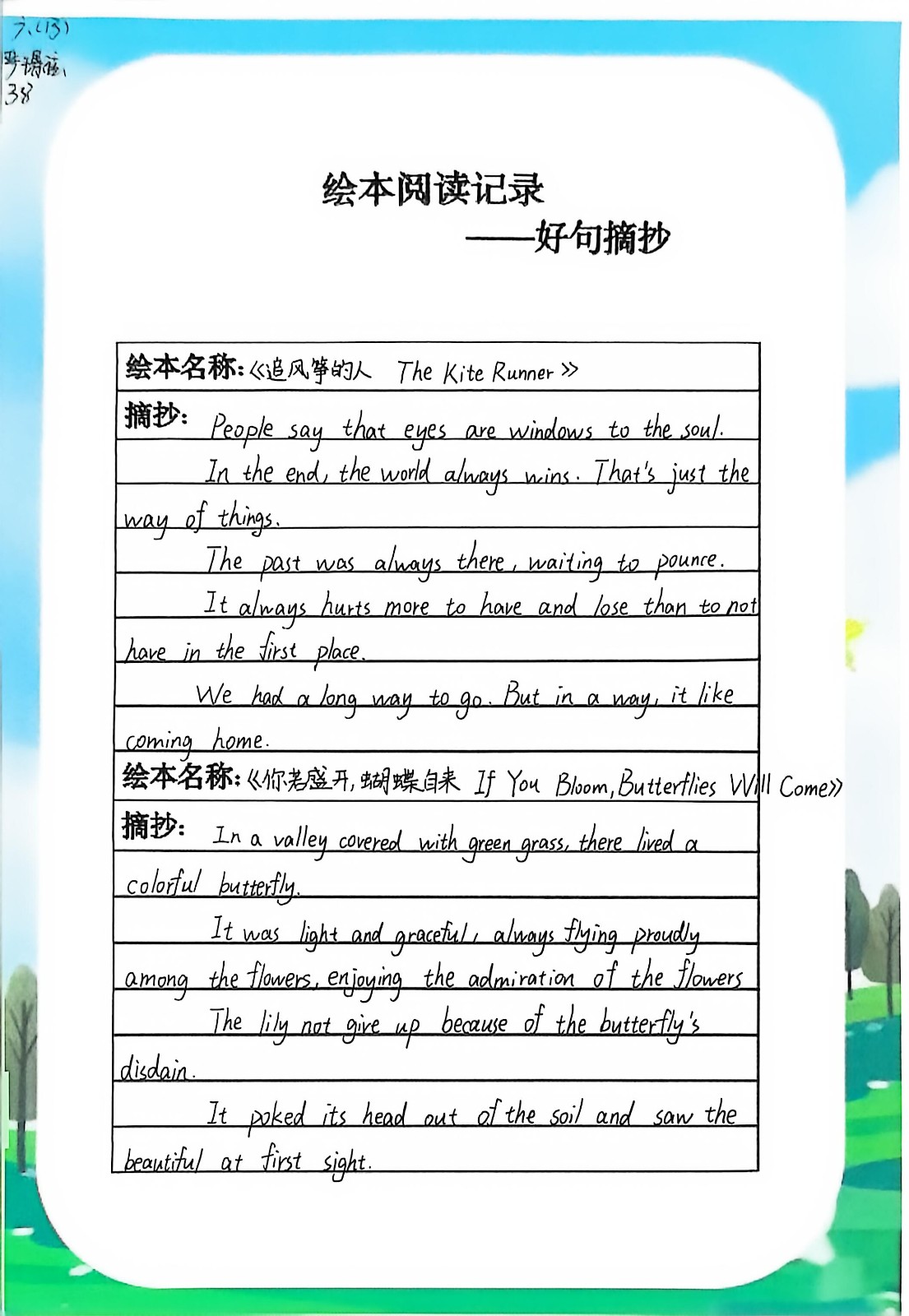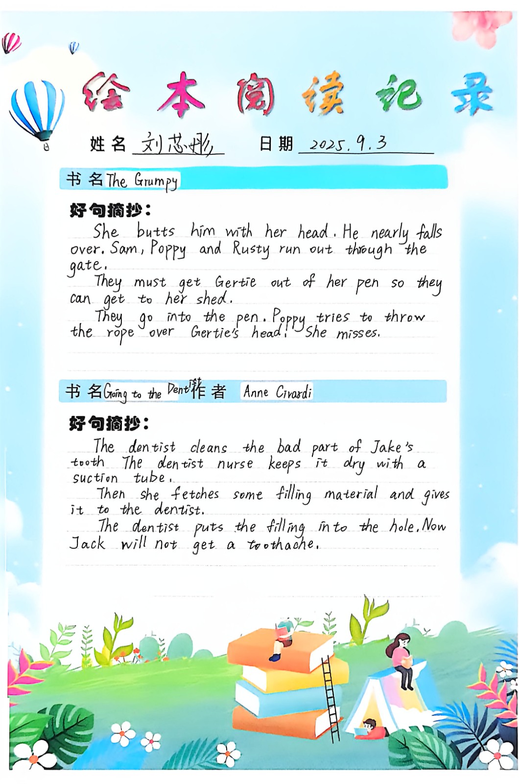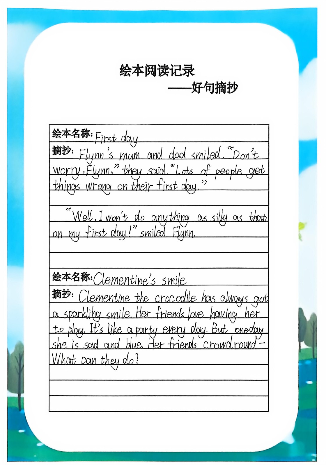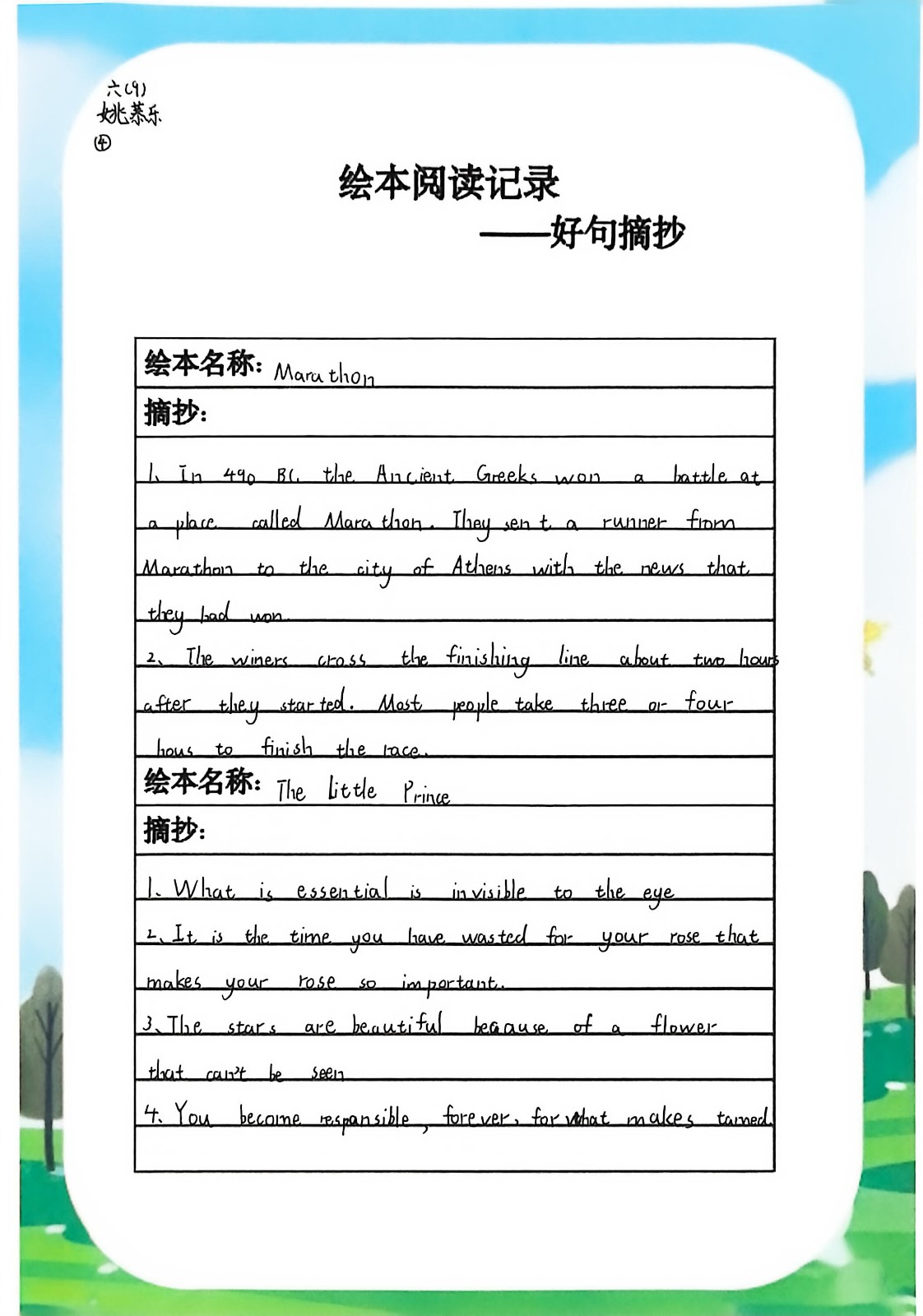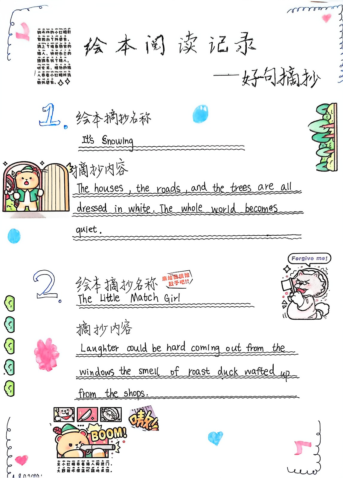暑假期间,小学六年级的同学们以英语绘本为桥梁,开启了一段充满趣味与收获的语言学习之旅,不少同学还认真进行好词好句摘抄,为英语素养提升添砖加瓦。