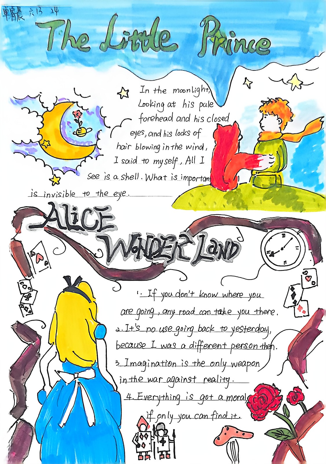 在同学们的摘抄本里,来自《First Day》的句子“Police officer Julie Nicks gave a robber an ice cream on her first day.”,展现出奇妙的故事场景;《Turtle's Party in the Clouds》中“All the winged creatures in the world at the party, glittering blue, green, purple, crimson, yellow below the sparkling silver stars. The moon smiled down.”,用丰富的色彩描写和拟人的手法,营造出梦幻氛围。