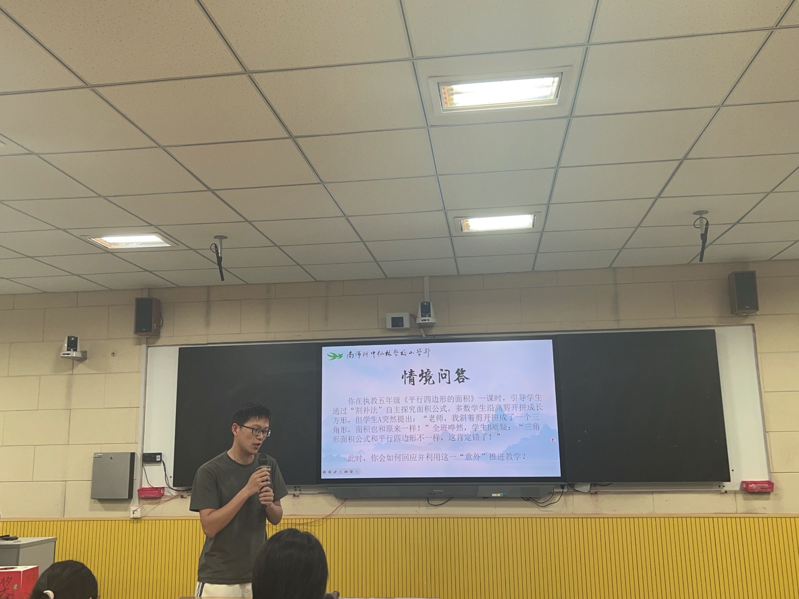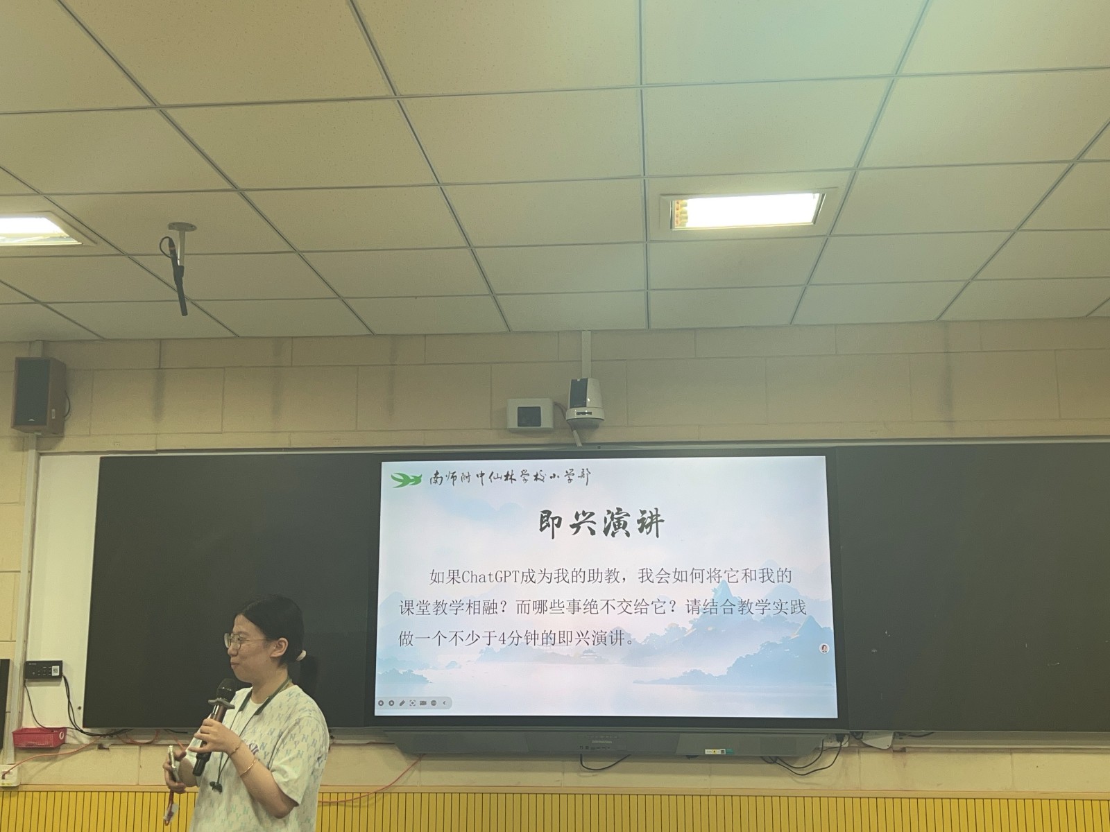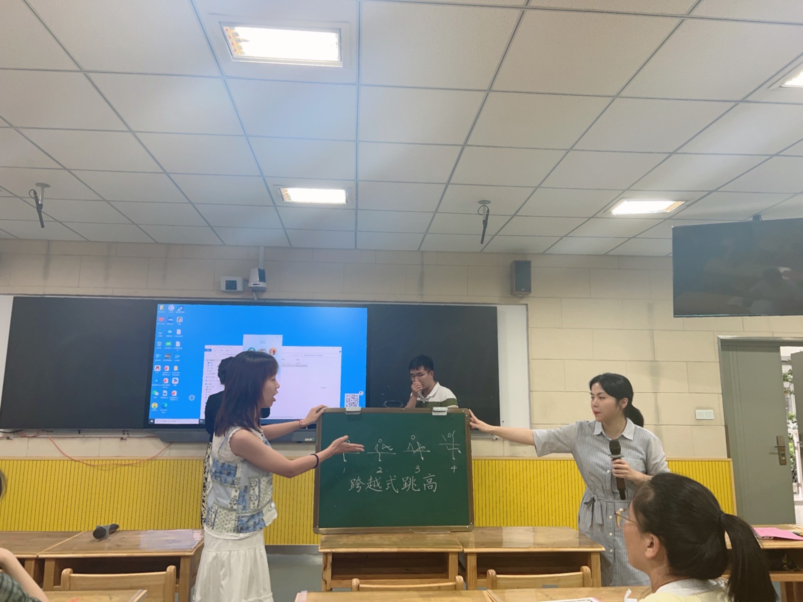 活动的高潮当属紧张刺激的“抽签即兴展示”环节。老师们随机抽取题目,或需对一堂模拟课进行“情境问答”,或需围绕特定主题展开“即兴演讲”;体育老师更是别出心裁,现场“抽签自选技术动作画小人图”,刘静老师以简洁生动的图示快速解析“跨越式跳高”动作要领,体现了扎实的学科基本功和教学智慧。这些即兴挑战不仅是对个人素养的检验,更引发了在场教师对教育教学实践的深度思考。
