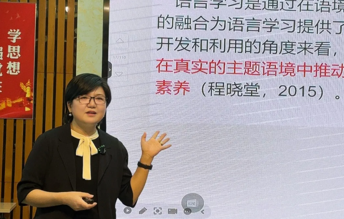 本次活动的主题为“单元整体教学视域下的课程资源融合研究”。叶畅老师受邀带来讲座《基于主题意义的小学英语主教材与绘本融合教学》。叶老师首先对两节精品课例给予了充分的肯定。接着,叶老师针对融合这一主题,从什么是融合?为何要融合?以及怎样融合?三个部分做了精彩阐述。叶老师指出,教材与绘本融合教学,即基于学生的认知水平,语言能力和生活经验,在分析完教材内容后,从主题意义、语言知识乃至育人方式等维度选择相应的绘本,将绘本适当、适度、适时地融入教材开展教学。绘本的选择应基于“话题(主题)契合、语言匹配、文本难读的相当、认知情感对应等原则”要“服务于主题意义、服务于单元整体”,促进核心素养培养任务的落实,实现“学科育人”。叶老师在讲座过程中,列举了大量课例,引用了多篇高质量论文,深入浅出地为一线教师讲解课内外资源融合的关键点及相关策略。