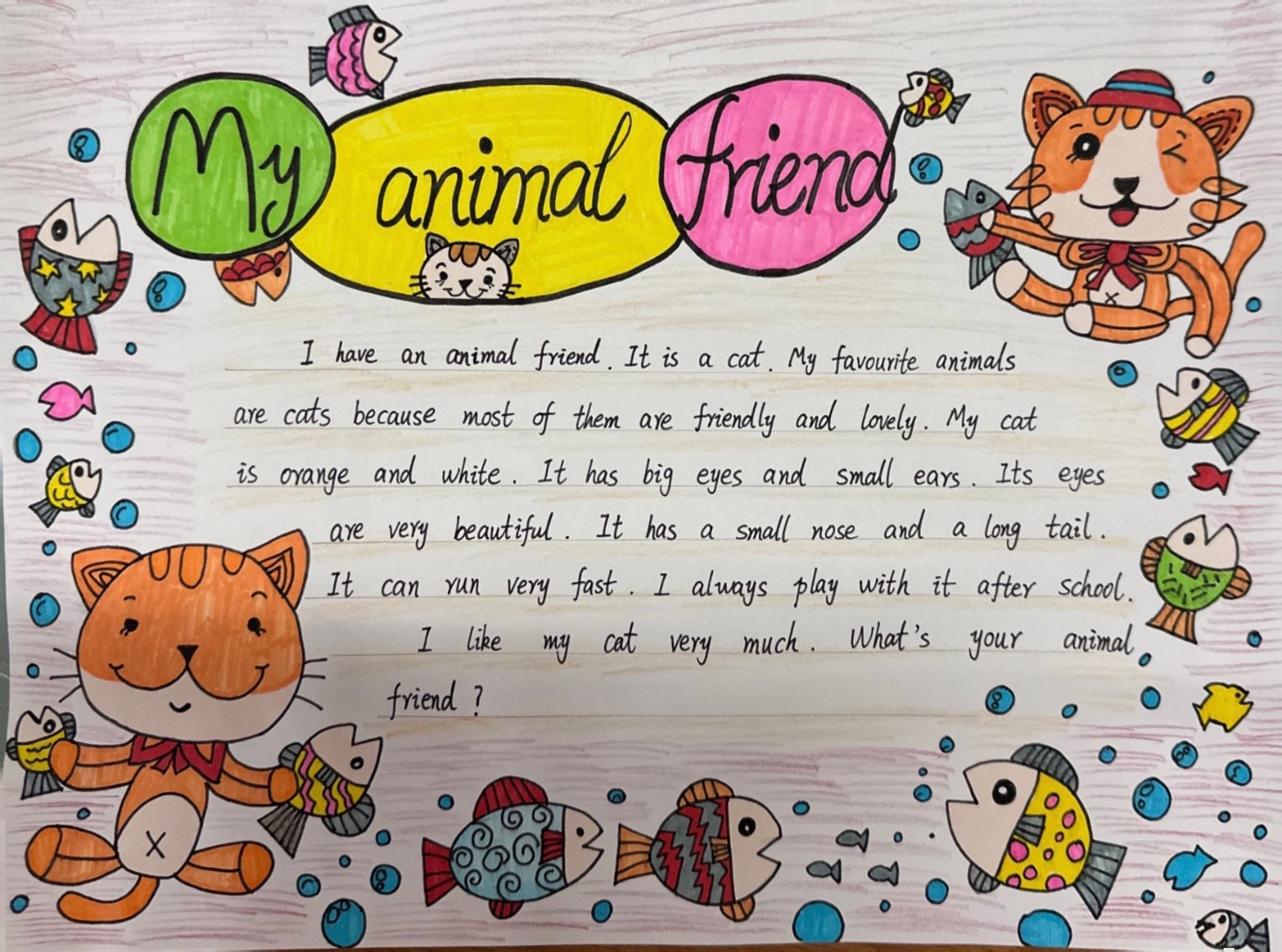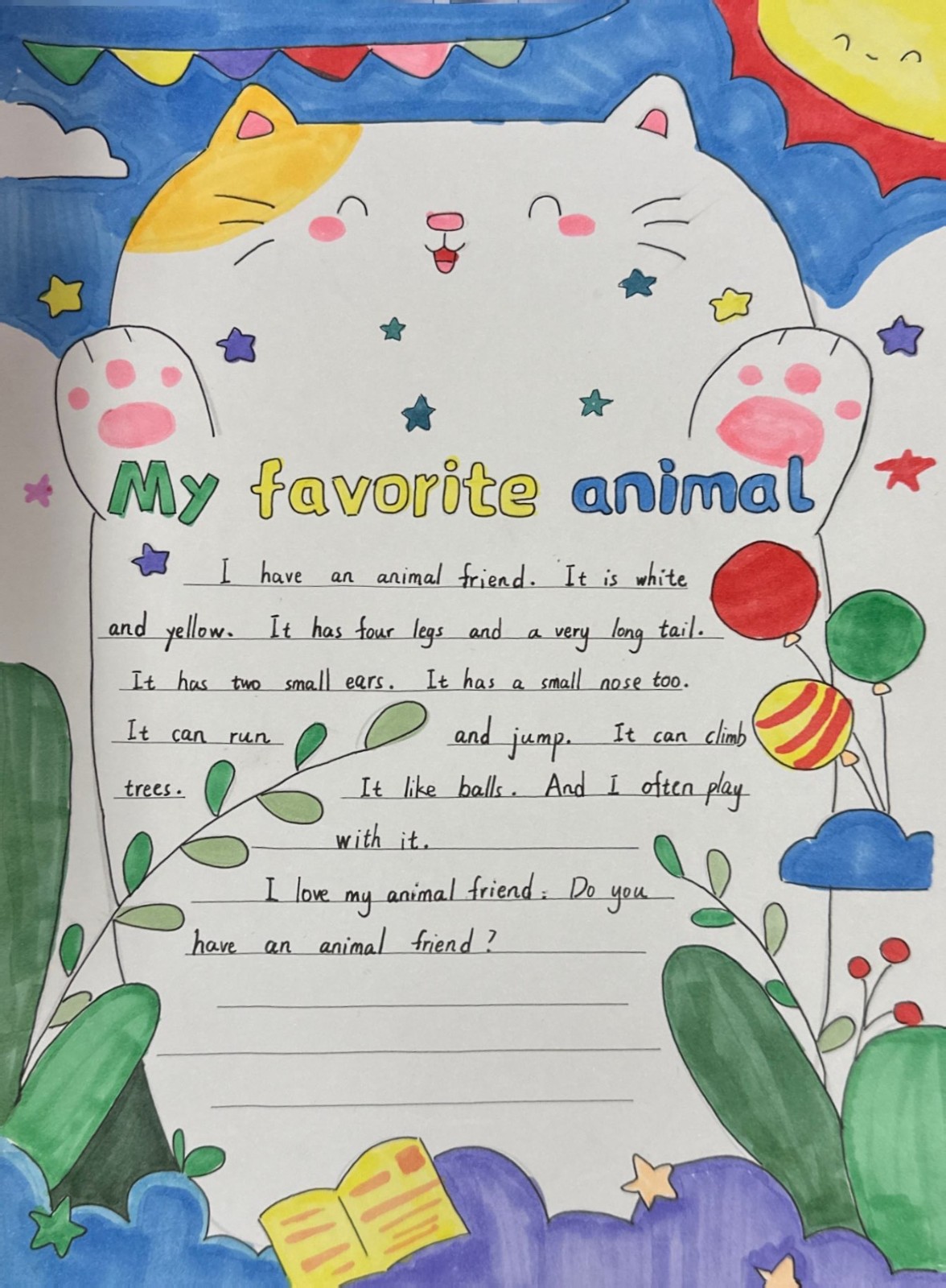 在国庆假期期间,我校五年级的同学们结合书本内容An Animal Friend”,纷纷拿起画笔,手绘了一幅幅充满童趣的英文小报。成功地将课本上的学习内容活化,在实践中综合运用语言知识,用英语向大家描述他们身边的可爱动物朋友。有的同学画了自己家养的小猫小狗,用生动的笔触和细腻的色彩描绘出它们的可爱模样;有的同学则选择了身边的野生动物作为主题,通过查阅资料,用英文描述了它们的生活习性和特点。每一幅作品都凝聚了同学们的心血和智慧,展现了他们对小动物的喜爱之情。他们不仅注重细节的表现,还巧妙地融入了英文描述,让读者在欣赏画作的同时,也能感受到动物们独特的魅力和特点。通过这次活动,同学们不仅巩固了课本上的知识,还提高了自己的综合素质。他们纷纷表示,这次手绘英文小报的经历让他们更加喜欢英语这门学科,也让他们更加关注身边的动物朋友们。