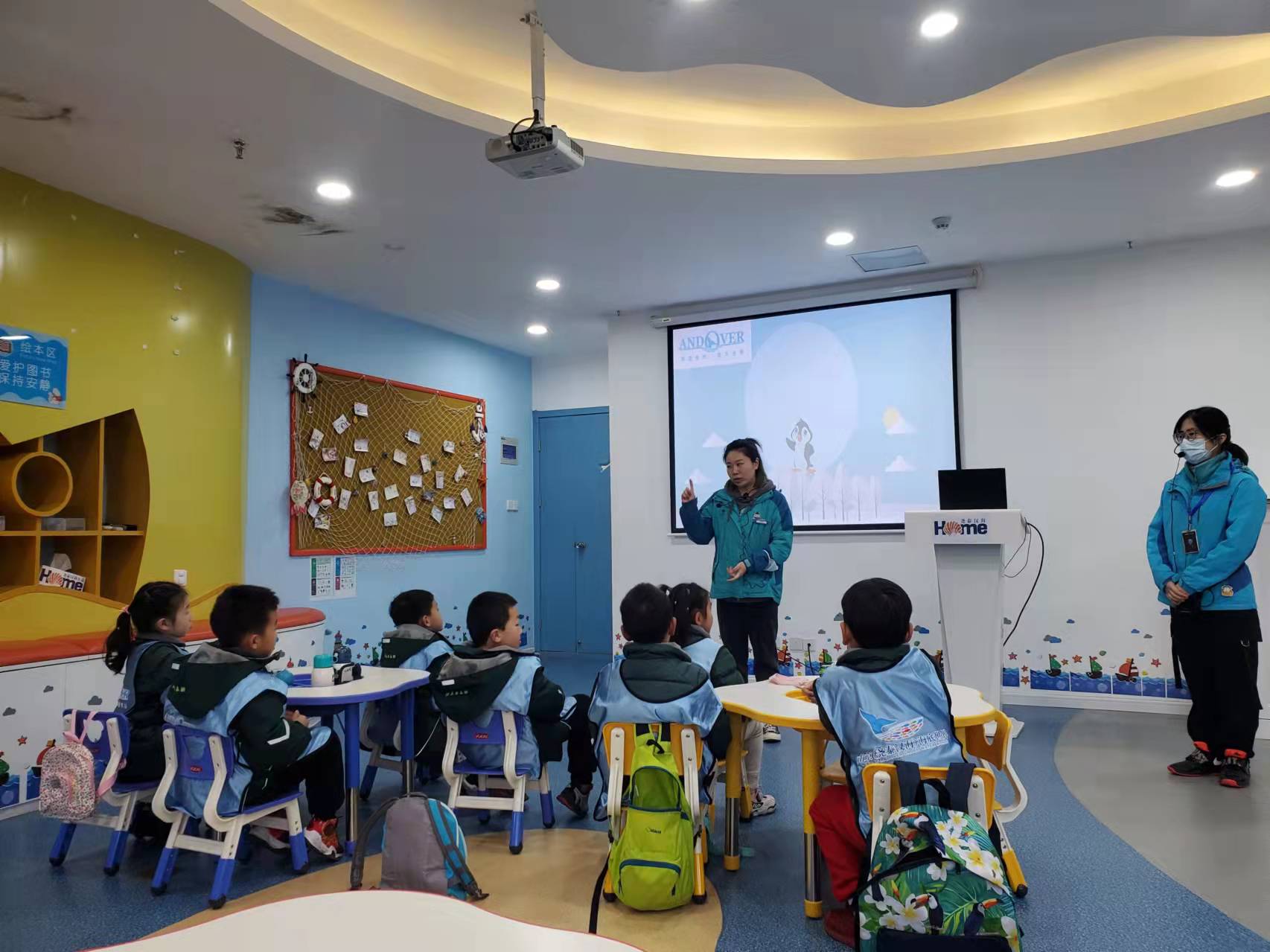 海底世界的妙妙老师开营,老师和同学们一起在海底世界的海洋科普教室进行了破冰仪式,大家自我介绍与老师互动,随后妙妙介绍了一天的活动安排。在上课之前同学们先谈了自己对企鹅的初步认识,接着老师向同学们介绍了企鹅的种类分布、体貌特征、生活习惯及生存环境,并通过有趣的游戏进一步加深对企鹅宝宝的认识。