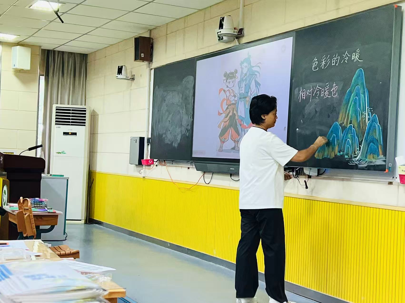 教师示范阶段,陆老师用彩色粉笔在黑板上现场绘制《青绿山水图》片段,巧妙融入冷暖色搭配技巧,直观的演示让学生收获颇丰。最后,学生结合所学的色彩冷暖知识,展开自主画面创作,将课堂所学转化为实践能力。